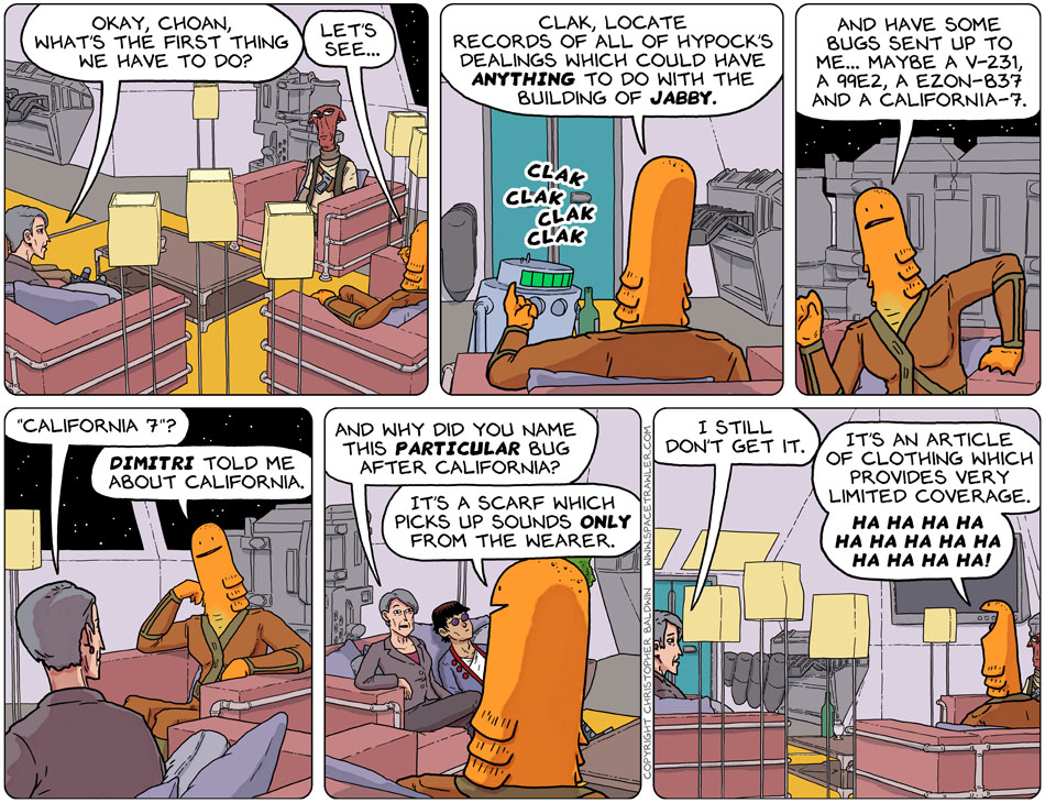 06/12/18 – California Bug Previous | Next 1st Series | 2nd Series | 3rd Series | First Strip Current Series | Archive | Most Recent Previous | Next 1st Series | 2nd Series | 3rd Series | First Strip Current Series | Archive | Most Recent Ah, California. How we love thee. First Strip First Series | First Strip Second Series | First Strip Current Series| Archive | Most Recent 06/11/18 – Orku-Ion 06/13/18 – Non-Human Biology 9 Comments Jim Campbell June 12, 2018 at 12:50 am 8 years ago Oh deary, deary me! Night-Gaunt49 June 12, 2018 at 12:54 am 8 years ago Alien humor. Or a human one filtered through an alien’s brain. Gregg Eshelman June 12, 2018 at 2:43 am 8 years ago But what about Californias 1 through 6? Coyoty June 12, 2018 at 3:49 am 8 years ago I’m disappointed it’s not a bikini. Yes, I know the only person who could wear it is Anesu… I’m disappointed it’s not a bikini. andreas June 12, 2018 at 10:44 am 8 years ago @ Coyote That’s ageist not to mention speciesist… Seymour Joseph June 12, 2018 at 2:18 pm 8 years ago She should have called it American Healthcare Insurance-7… M.A. June 12, 2018 at 4:55 pm 8 years ago Well, I sure don’t want to see Jibbz in a bikini, whatever that makes me… Muzhik June 12, 2018 at 9:50 pm 8 years ago Wise. Peter Rogan June 12, 2018 at 10:13 pm 8 years ago I never heard of a California-7 before in my life, but now I desperately need one to fill the hole that suddenly has appeared in my being. Leave a Reply Cancel reply Your email address will not be published. Required fields are marked *CommentName* Email* Website Notify me of follow-up comments by email. Notify me of new posts by email.