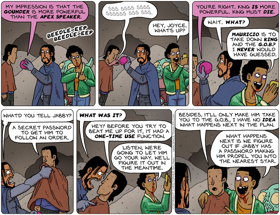 I trust Anesu, beaten-up and dizzy as she is, still understands that Bag-O-Snakes here has a compatriot if not an entire organization at the G.O.B. waiting for King to go down, and that sufficient ‘leverage’ carefully applied could reveal their identities. I wonder how Bikkie would feel about punching out a bag of snakes. Come to think of it, I wonder how Bikkie WOULD punch out a bag of snakes.