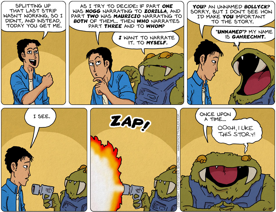 I would love to have Jabby narrate, and be an utterly unreliable narrator, and every other strip is the other characters correcting Jabby’s version of events with one much closer to reality.
