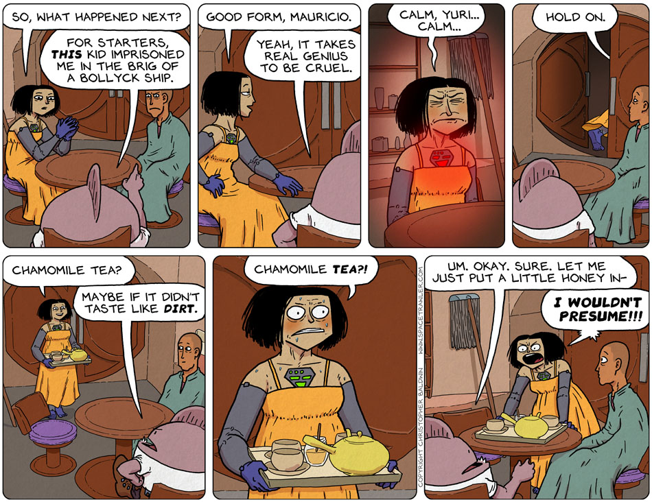 Sometimes I wonder how Nogg has survived this long. He has to be totally clueless to not know better than setting Yuri off. Even if Yuri was a gentle calm person normally, that’s no way to act when someone asks if you’d like tea. Mr. Zorilla and Nogg would be great friends if they weren’t so selfish.