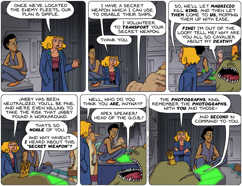 I’m so disappointed with King. It sounds like he really hit rock bottom after losing Oola. I don’t recognize this broken shell of a mirrghroot any more. He’s become pathetic, reactive, completely without initiative or imagination. A leader so crippled cannot remain in possession of his domain for long; a more-imaginative, less-depressed leader will rise in his place.