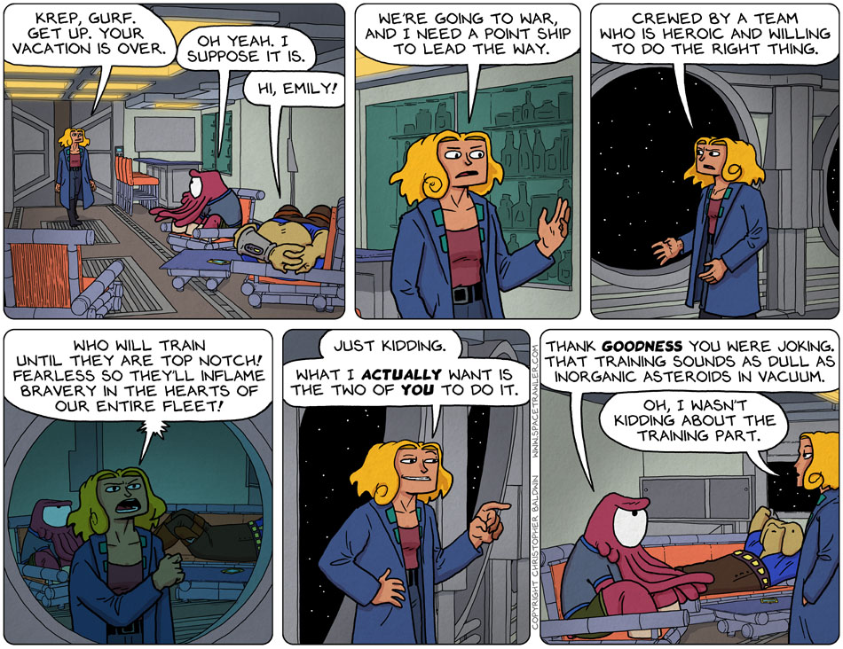 Emily’s got one hell of a motivational routine, doesn’t she? Load on the guts and glory she KNOWS neither Krep nor (well, maybe) Gurf will respond to, then make it clear they’re going to work their tails off to get good and ready to kill and get killed, like it or don’t. Not even as effective as the late R. Lee Ermey, and no where near as funny.