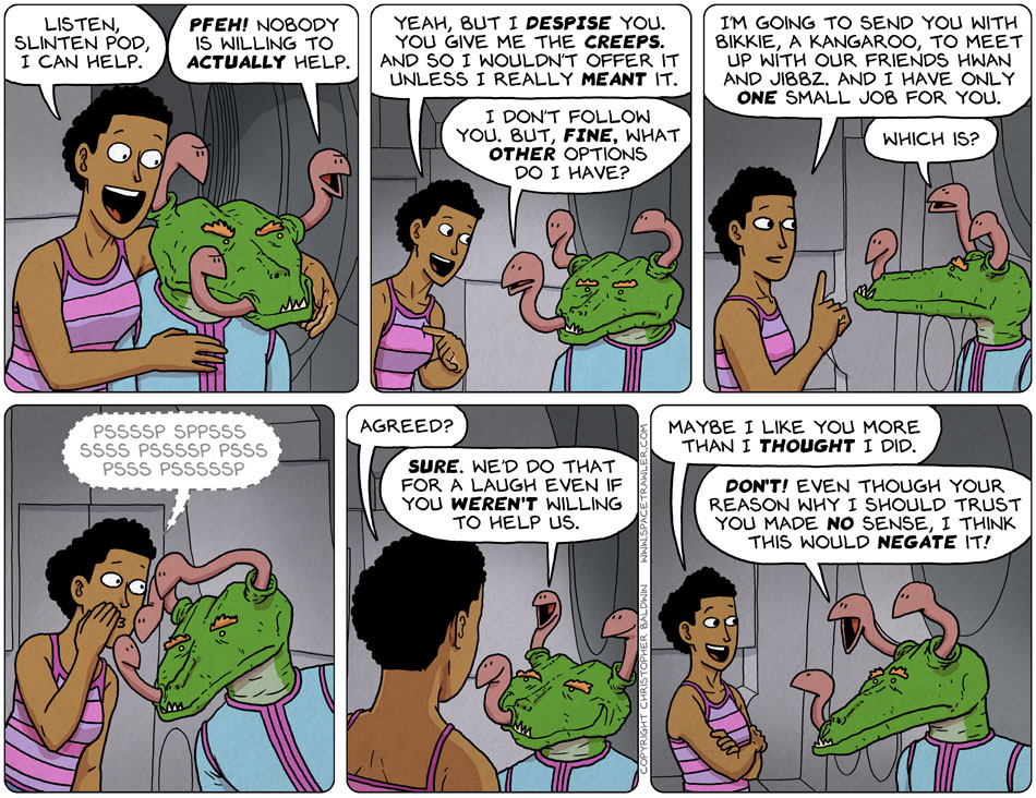 To boot, the snakes themselves apparently are doing so to escape persecution, yet another worthy twist that I am sure will keep devoted fans spellbound before finally being revealed in Spacetrawler XLII by Anesu’s quarter-eeb grandson, whose reliability as narrator, however, will be endlessly analyzed on the forums of the Slinten podcast.