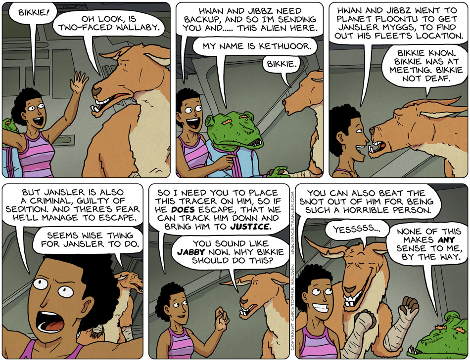 Bikkie smiling in the last panel is… disturbing. Have we seen him smile before?