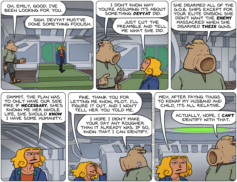 10/15/18 – Something Foolish Previous | Next 1st Series | 2nd Series | 3rd Series | First Strip Current Series | Archive | Most Recent Previous | Next 1st Series | 2nd Series | 3rd Series | First Strip Current Series | Archive | Most Recent All in a hard day’s work. First Strip First Series | First Strip Second Series | First Strip Current Series| Archive | Most Recent 10/11/18 – Gentle Kidnapping 10/16/18 – Setting Up Meetings 3 Comments andreas October 15, 2018 at 6:30 am 7 years ago re: 3D reconstruction for pose estimation Chris, if you’re so inclined, could you follow up on https://www.baldwinpage.com/spacetrawler/2018/09/25/92518-g-o-b-head/ 😉 Christopher Baldwin October 15, 2018 at 10:56 am 7 years ago Followed up! Thanks for the reminder! 🙂 Coyoty October 16, 2018 at 1:43 am 7 years ago You should not use taking your family hostage as an argument when making a case for your humanity. Doing it for their own good isn’t a great excuse when Devyat disabled the ships for your own good. Leave a Reply Cancel reply Your email address will not be published. Required fields are marked *CommentName* Email* Website Notify me of follow-up comments by email. Notify me of new posts by email.