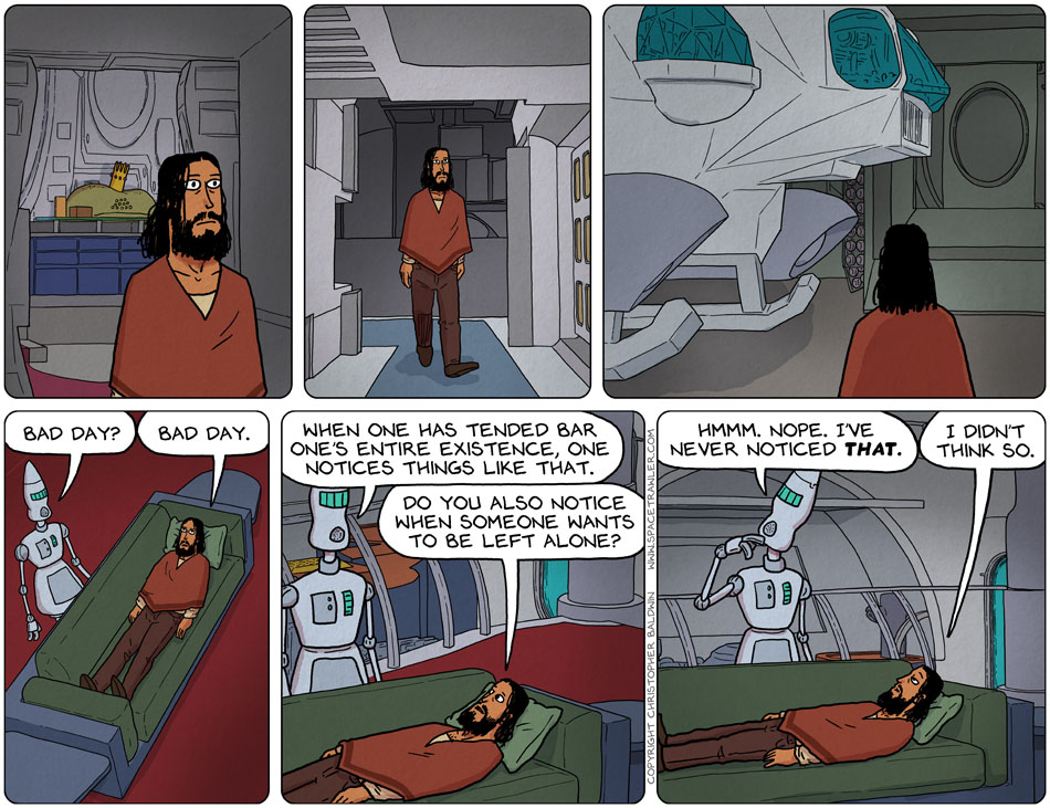 Most people who encounter Barbot have come to *him*, not vice versa, and they *always* want to talk: “One Bourbon, One Scotch, and One Beer!” or “Gimme another, tarbender, I haven’t passed out yet.”