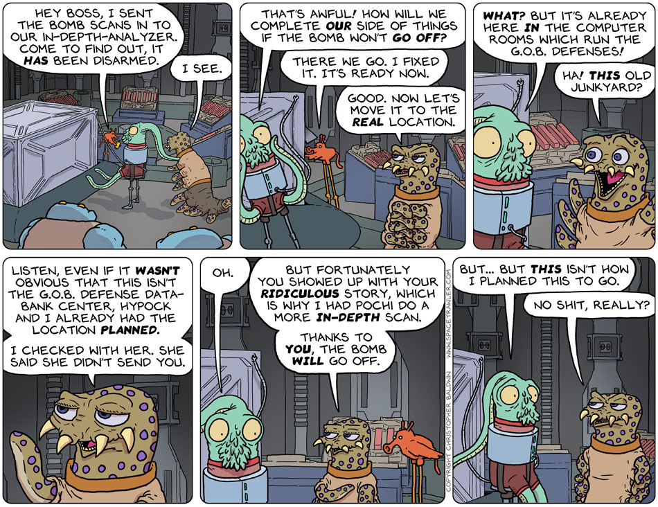 All that is needed is for Wezzle to put her tentacles to her face as in the second frame, turn to the fourth wall and say, “Alas! Alack! Our plans have come undone!”