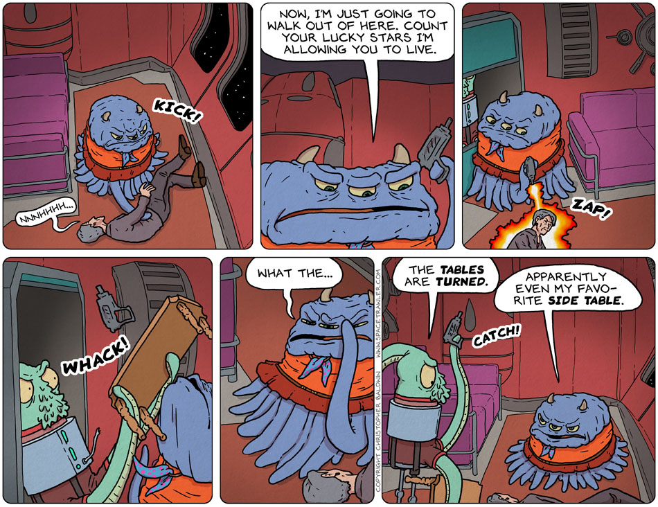 01/30/19 – Lucky Stars Previous | Next 1st Series | 2nd Series | 3rd Series | First Strip Current Series | Archive | Most Recent Previous | Next 1st Series | 2nd Series | 3rd Series | First Strip Current Series | Archive | Most Recent I think that table is based on my childhood coffee table, well, except it was light blue. First Strip First Series | First Strip Second Series | First Strip Current Series| Archive | Most Recent 01/29/19 – List of Strengths 01/31/19 – Too Dumb 9 Comments Coyoty January 30, 2019 at 2:00 am 7 years ago “Wezzle, how did you get this evidence against Hypock?” “Two turned tables and a microphone.” midgetninja January 31, 2019 at 11:02 pm 7 years ago i love you so much for this Herb January 30, 2019 at 11:07 am 7 years ago Well, Hypock is light blue even if the coffee table isn’t. Christopher Baldwin January 30, 2019 at 6:53 pm 7 years ago My subconscious at work! 🙂 Peter Rogan January 30, 2019 at 2:26 pm 7 years ago Ha! Wezzle to the rescue! Who’da thunk it? What’s her next step? pbarnrob January 30, 2019 at 6:22 pm 7 years ago Wait, what? You served coffee as a child? Horrors! /snerk!/ Christopher Baldwin January 30, 2019 at 6:54 pm 7 years ago But if I had, it would explain so much! TB February 1, 2019 at 9:26 pm 7 years ago Points to the ones who called the “glass jaw.” Kaidah November 5, 2019 at 10:02 am 6 years ago Looks like Emily gave Wezzle the same lesson she once gave Martina. https://www.baldwinpage.com/spacetrawler/2010/10/31/spacetrawler-89/ Leave a Reply Cancel reply Your email address will not be published. Required fields are marked *CommentName* Email* Website Notify me of follow-up comments by email. Notify me of new posts by email.