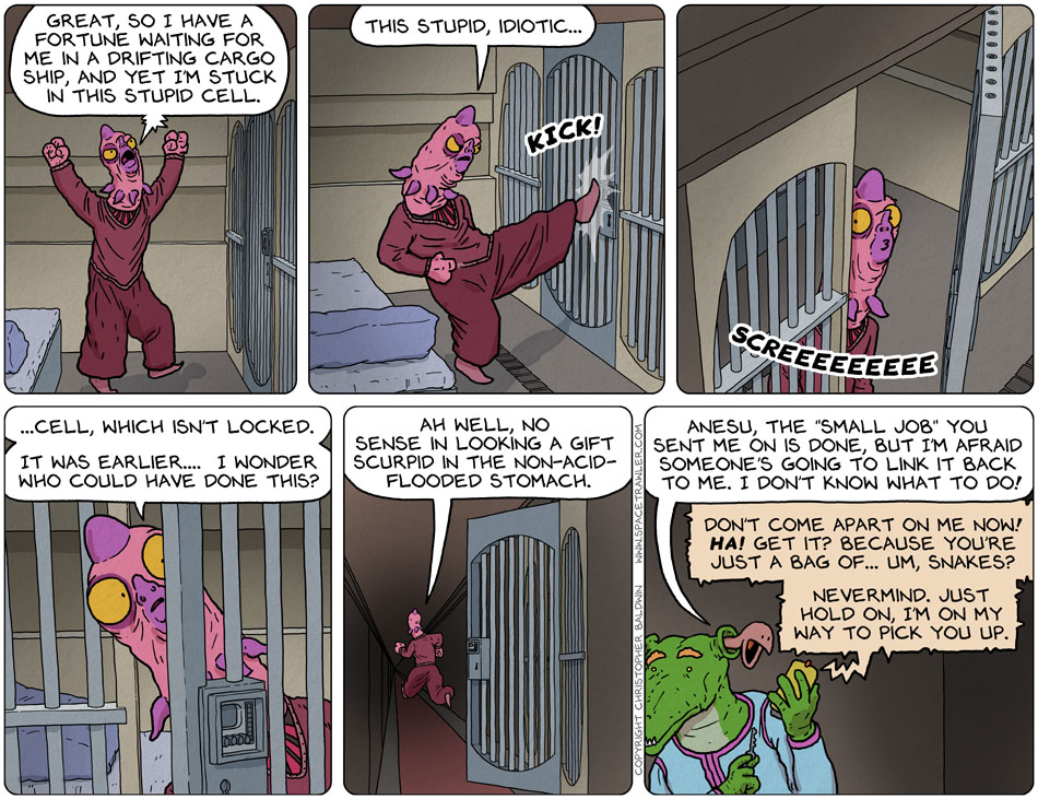 Now he has to figure out what has happened. Do any of his captors like to hunt intelligent life-forms? Or has there been sabotage? Or is someone space happy? Just git!