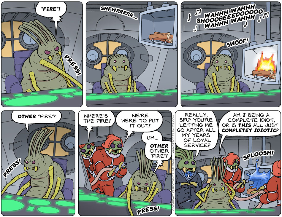 Reminds me of the very first Spacetrawler scene, where all the GOB ships at a certain port were reprogrammed to make fart noises instead of taking off. Ol’ Chris likes his slapstick.