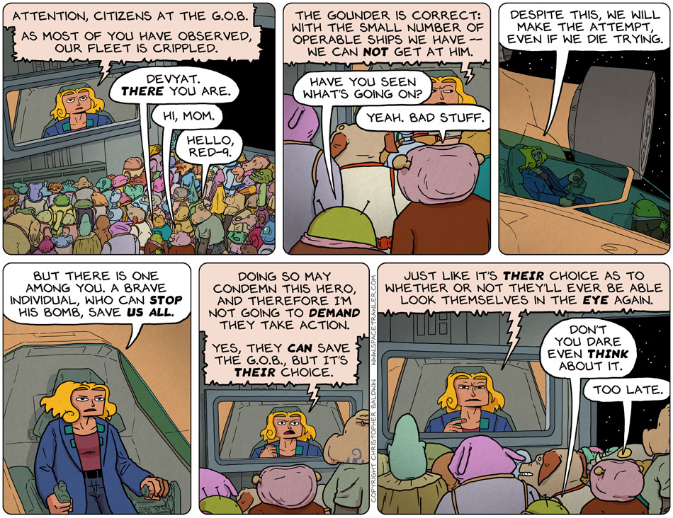 Now the Galaxy will wonder who it really was that Saved the Day and even in the best of circumstances, it’s Devyat’s death sentence. Somebody’s gonna find out. Or blab. Or make a lucky right guess. And then the mob will appear and darkness will fall again.