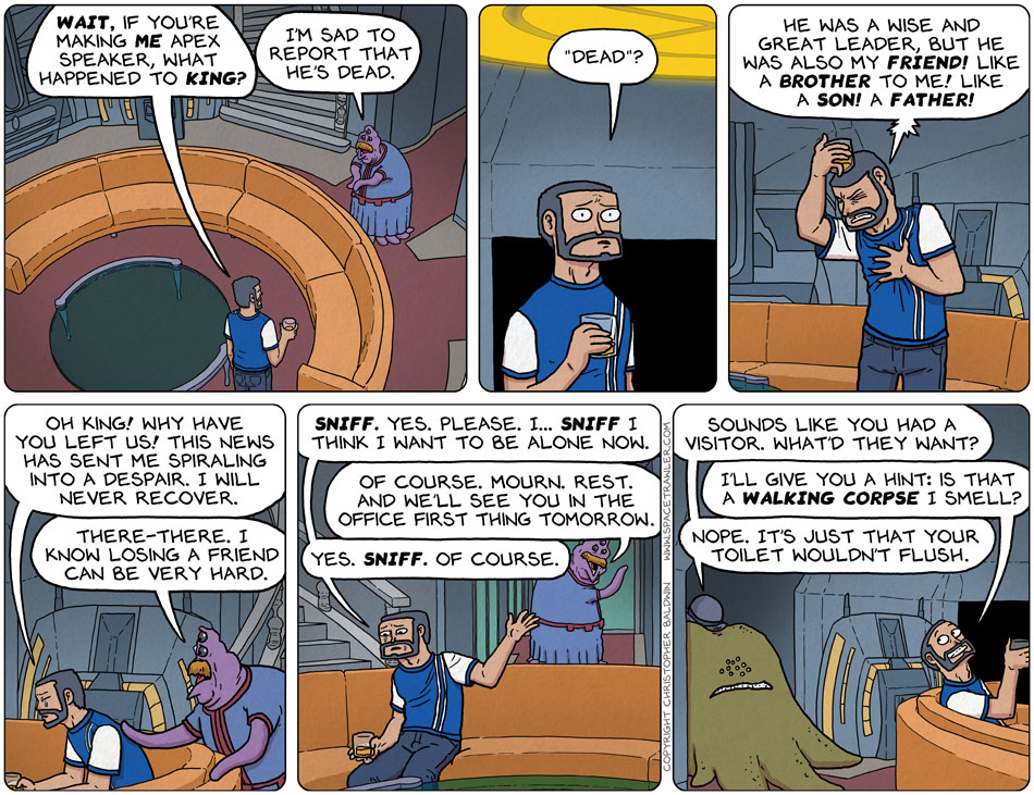 03/28/19 – All Relative Previous | Next 1st Series | 2nd Series | 3rd Series | First Strip Current Series | Archive | Most Recent Previous | Next 1st Series | 2nd Series | 3rd Series | First Strip Current Series | Archive | Most Recent Big tragedies and little tragedies all smell about the same. First Strip First Series | First Strip Second Series | First Strip Current Series| Archive | Most Recent 03/27/19 – Back On The Job 04/01/19 – A Father’s Worries 9 Comments Coyoty March 28, 2019 at 12:50 am 7 years ago I guess King didn’t have a royal flush. “Is that a walking corpse I smell?” “Nope. It’s just Coyoty’s joke.” Paul March 28, 2019 at 3:48 am 7 years ago I’d follow up with a better joke but that just isn’t in the cards. Thracecius March 28, 2019 at 12:20 pm 7 years ago I don’t think I want to play cards with either of you if they smell of like a lavatory. π Gorbashsan March 28, 2019 at 2:27 pm 7 years ago These puns are crappy and you all know it. 32568 Dies A Lot March 30, 2019 at 4:45 am 7 years ago What is this, a shitty pun club? David March 30, 2019 at 7:22 pm 7 years ago Let’s call in Jay Sherman’s opinion: It stinks! Gregg Eshelman March 31, 2019 at 4:42 am 7 years ago Oh poo! Randall R. Besch March 28, 2019 at 10:53 pm 7 years ago “Hey Bub, you need a better toilet. It’s kinda backed up now. Peter Rogan March 28, 2019 at 11:56 pm 7 years ago I find that big tragedies smell like little tragedies only if the little ones are very close. Like in your lap. Otherwise, they’re safe to ignore. Leave a Reply Cancel reply Your email address will not be published. Required fields are marked *CommentName* Email* Website Notify me of follow-up comments by email. Notify me of new posts by email.