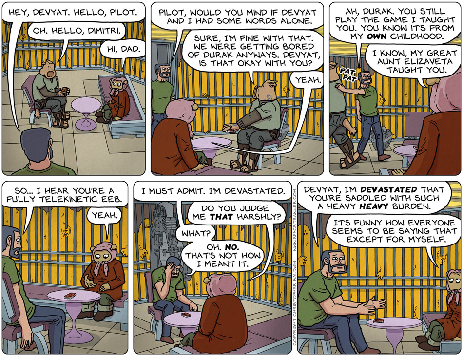 Ah, Dimitri, you old dog, surprised your daughter and yet sound like everyone else about your daughter’s massive powers. Powers that scare the shit out of everyone. And she is so melancholy about it since we know what the clampless Eebs did in retaliation for their slavery. Save the galaxy is a good idea but then what?