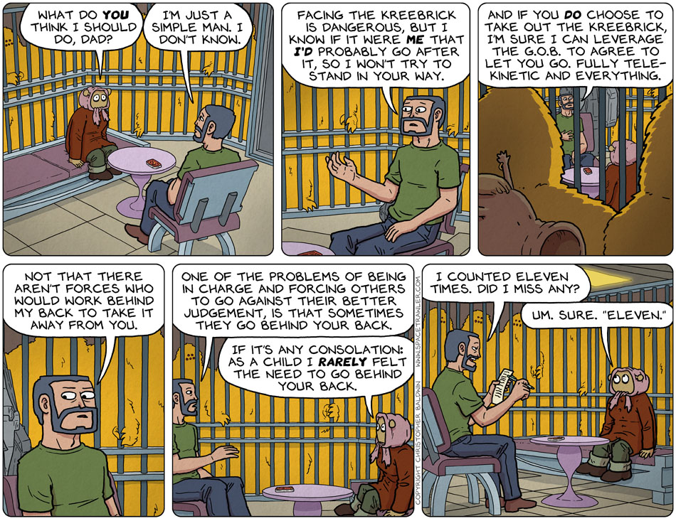 Nice view shift in panel 3. Random thought: I hope Devyat doesn’t need to go to the bathroom since there doesn’t seem to be one. Maybe there’s a potty-bot under the bed?