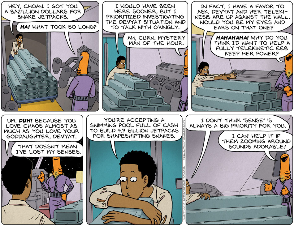I still don’t understand why they need *individual* jetpacks, so I’m taking it as read that the author, too, thinks that a bunch of snakes zooming around with individual jetpacks sounds adorable. 🙂