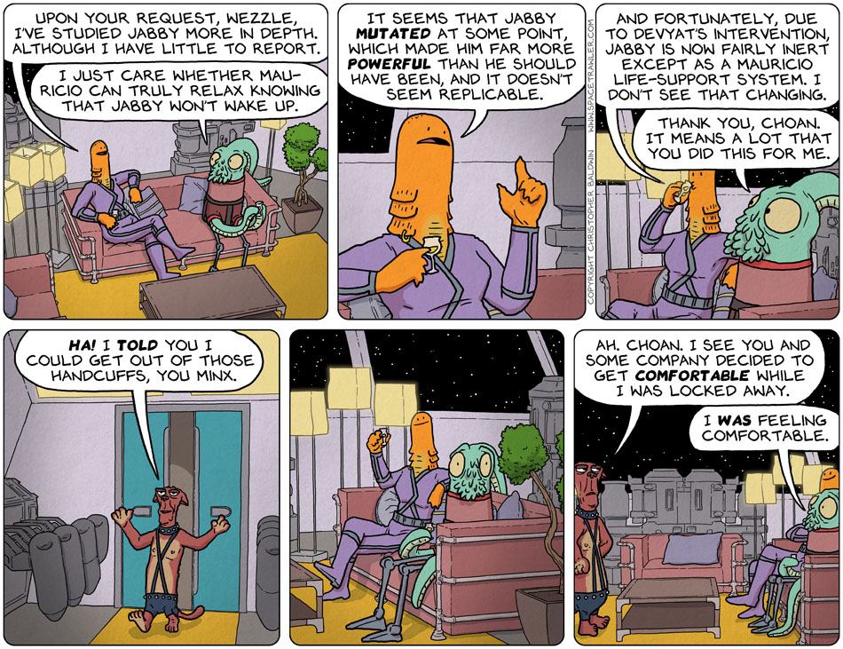 Ha! It took me several minutes to realize why Jibbiz was “locked away”. Plus comparing his clothes from past strip with the leather-man outfit in this one.
