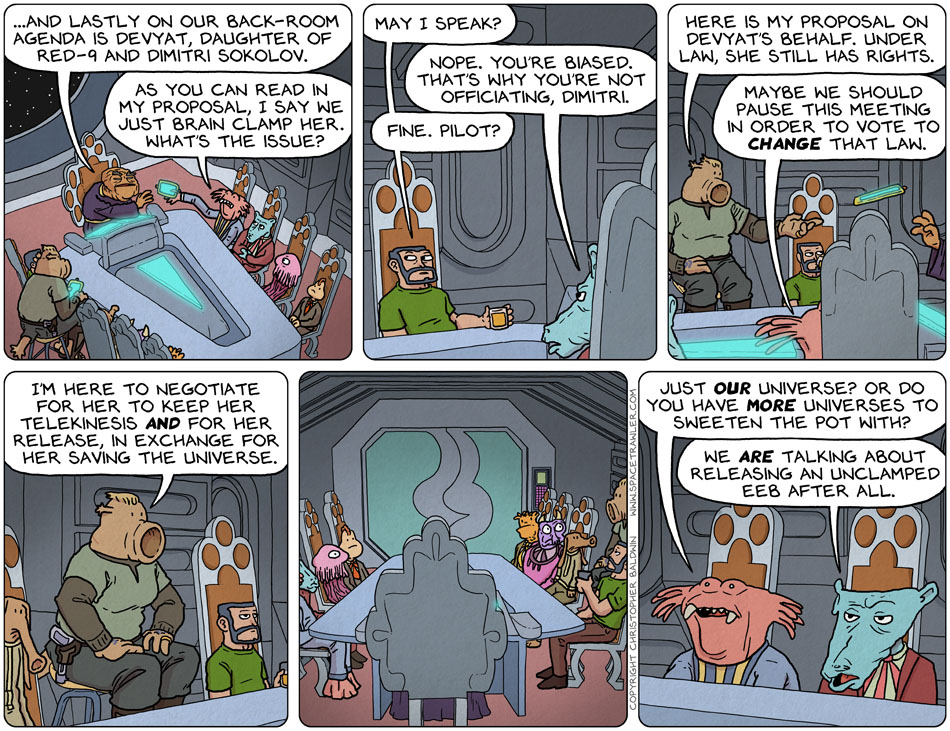 Holy continuity error! In panels one and six, coral-colored fang guy is at the end of the table nearest the presider, but in panel five, turquoise skeptical dude is at the corner, and coral-colored fang guy appears to be absent.