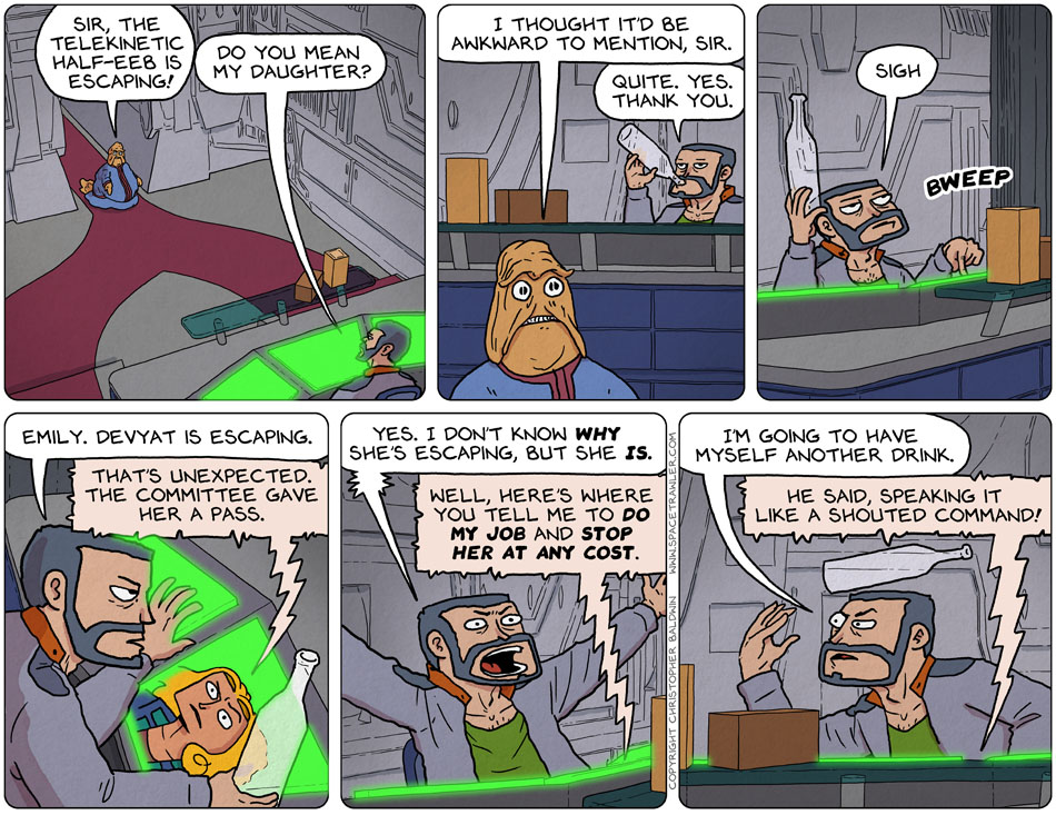 Dmitri’s inebriation bothers me. No– it shakes me. This is something like seeing a rainbow upside-down, a thing that absolutely should not exist, and pondering its cause and origins only leads to existential despair. Dmitri’s been expecting a different tragic outcome for at least one bottle, but what that was, what it could imply, where it could lead him, Devyat, and the Galaxy — these are things not visible and possibly beyond any explanation. For the love of Drak-Sim, what is happening to Dmitri??