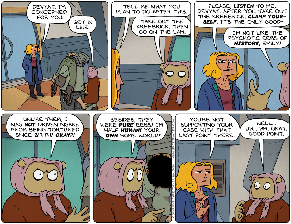 The best solution I can see is for Emily to go along with Devyat and see to the destruction of the second Kreebrick, after which the argument can resume, Devyat can reshape Emily’s consciousness to report Devyat died, or agree to carry on the deception so long as Devyat remains invisible to authorities, or Devyat can… But why give it away?