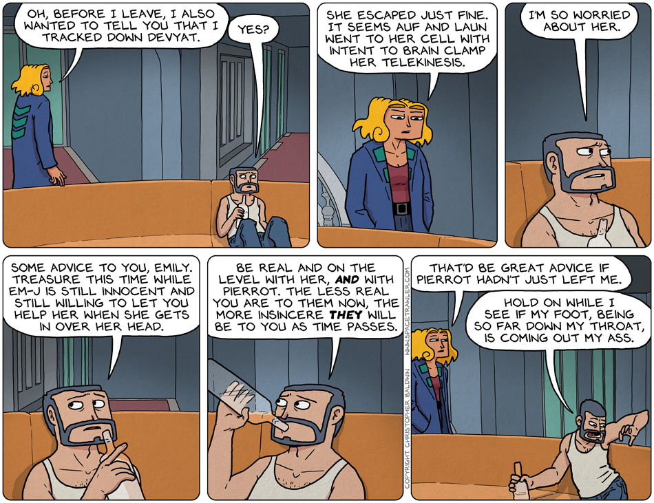 The question remains as to what Dmitri will do with himself, now that Devyat has outgrown him. And he badly wants those gone days back, never mind how ridiculous that is now. He has to grow a good deal more than Emily, and while she knows where she must go, Dmitri has no clue. And all I can think of is: Where the devil is Red-9?? She’s as responsible for this situation as he is — doesn’t it occur to her what’s going on? She’s had plenty of time to recover from Devyat’s zapping — why isn’t she here with Dmitri?