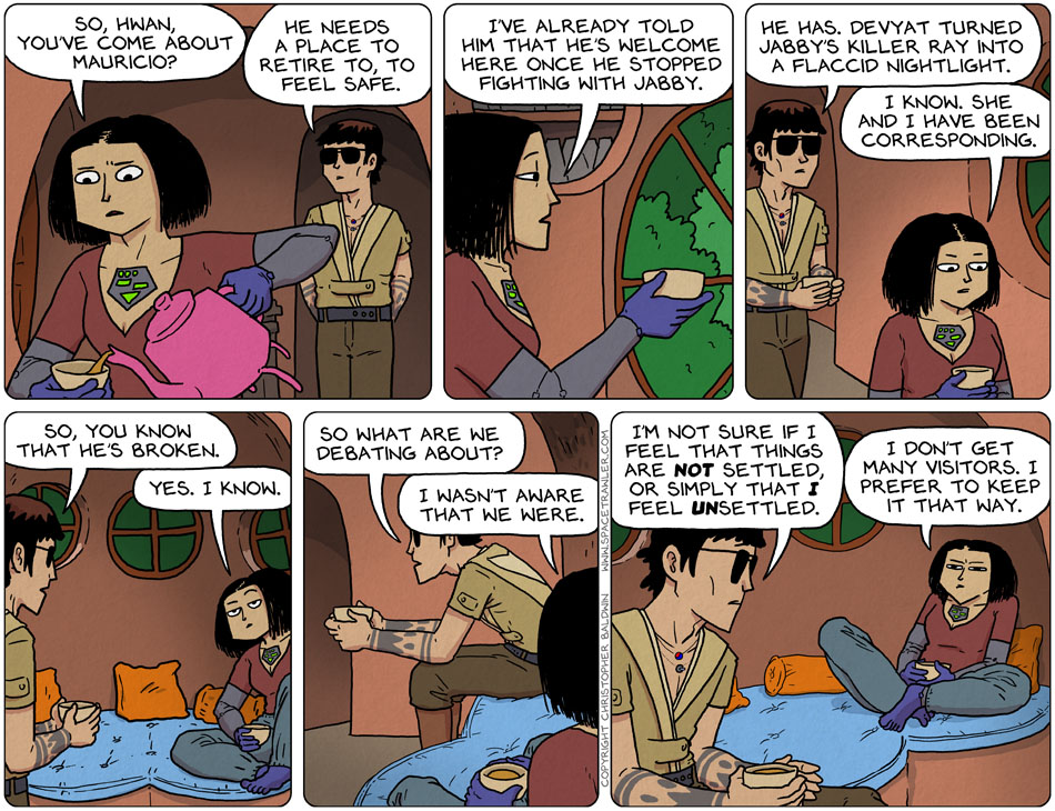 Hwan has shown vulnerability only once, when he denounced Joyce’s support of him. And was rewarded with a charge of incompetence for letting half the Crints die. That he shows it again to possibly the only person with the capability and the emotional strength to harm him (aside from Joyce) says something. What, I’m not sure. It’s up to Yuri to decide what to do with him. Qu’est-ce que fait faire de toi?