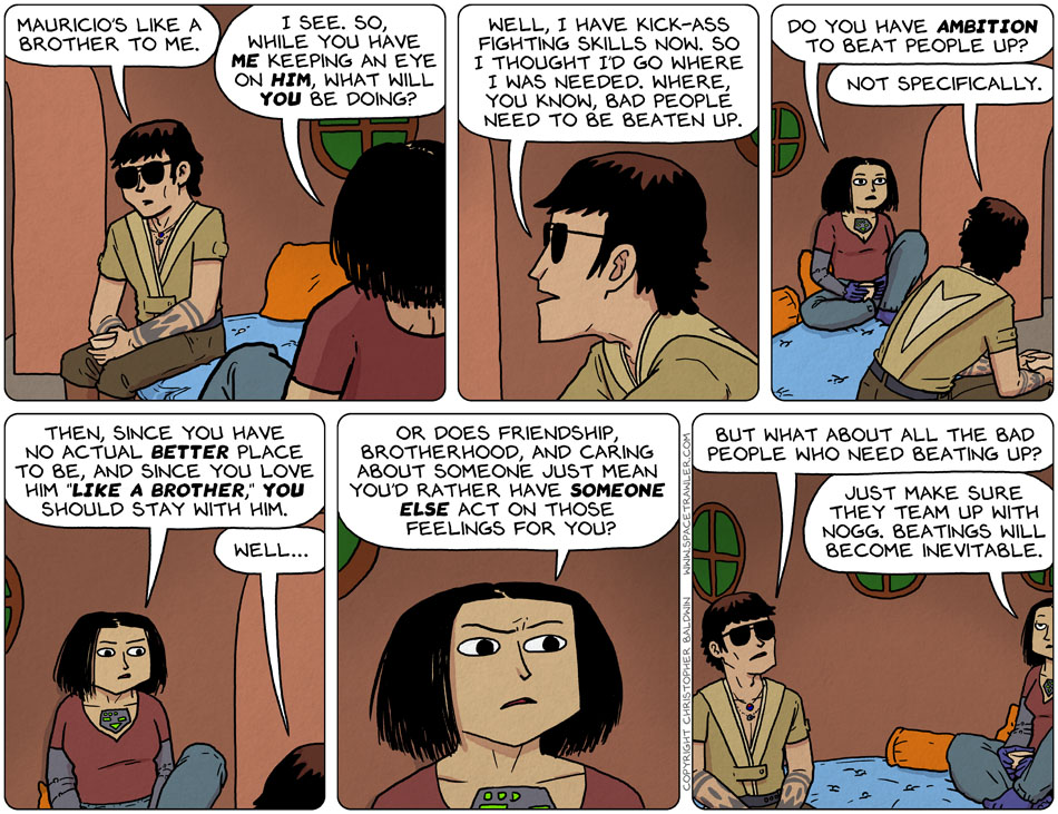 Hwan an Mauricio, maybe Bikkie too so that they have some action even if it is swatting at flies with raucous blood lust. Their unexpected adventures just walking around and flying around to random planets. Bikkie being the catalyst for at least 75% of the action. Amazing what a vagabond nomad life can do. That and a crazed 7ft tall kangaroo who is itching for a fight just to fight…just so that Jabby doesn’t kill people anymore. Even when they need him to.