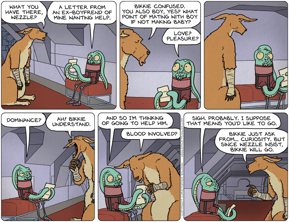 @Meran, if the Kickstarter reaches the next stretch goal and I do the Wezzle/Bikkie storyline, I’ll try to include Wezzle without his “legs” device. 🙂
