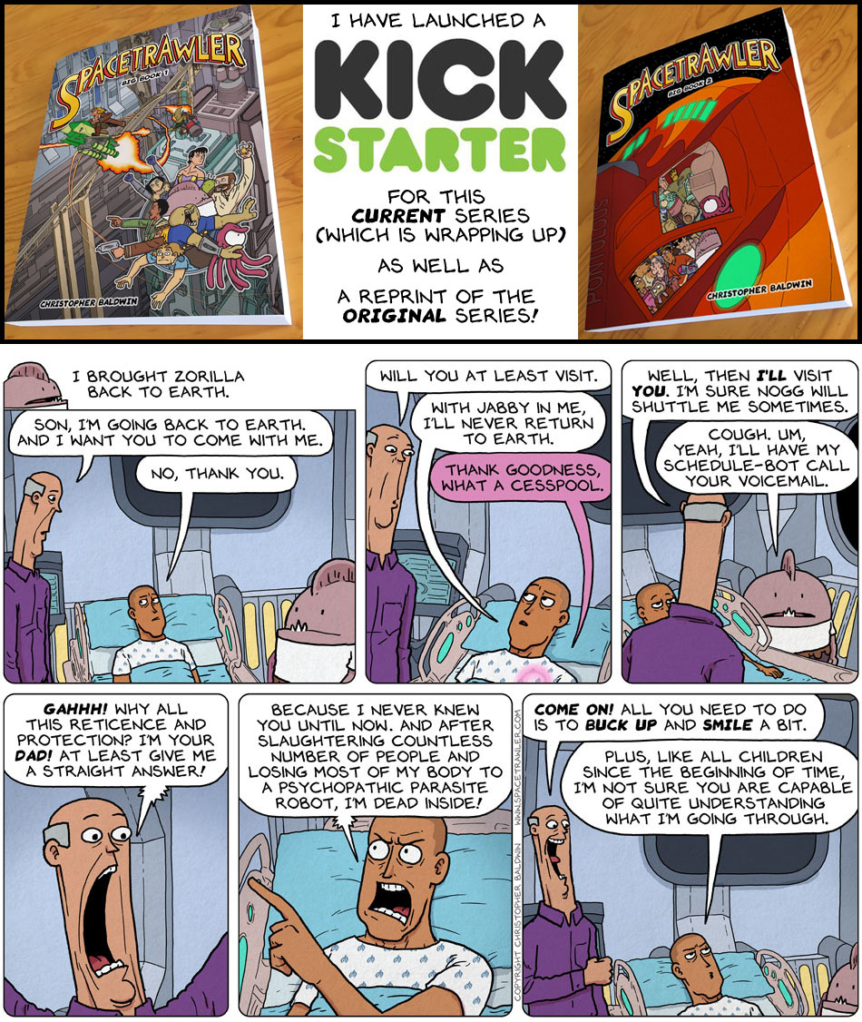 B: As far Mr. Zorilla is concerned, he is an astounding idiot, but he’s an astounding idiot who jumped in front of an armed alien to save his son. More than once, in fact. Laying there with one arm blown off, he tried to convince his son that he was not guilty of the murders Jabby had committed.