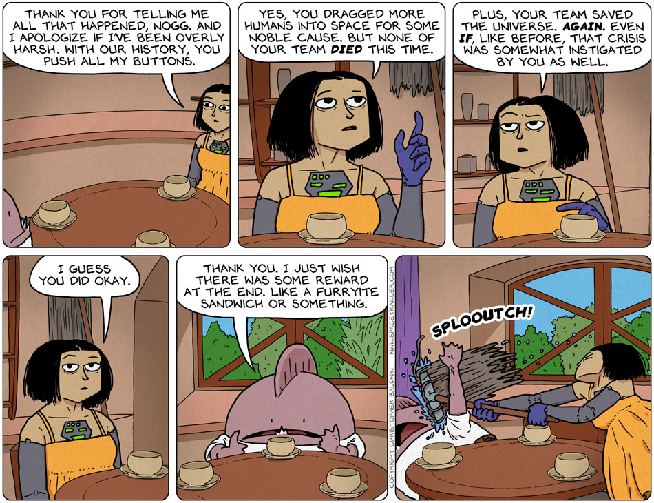 And so my hope becomes forlorn. Sigh. But Nogg asked for it. He really did. The last person in the Galaxy to confess a hankering for furryite flesh to, and he does. He’s lucky the mop came first, and not the withering energy blast.
