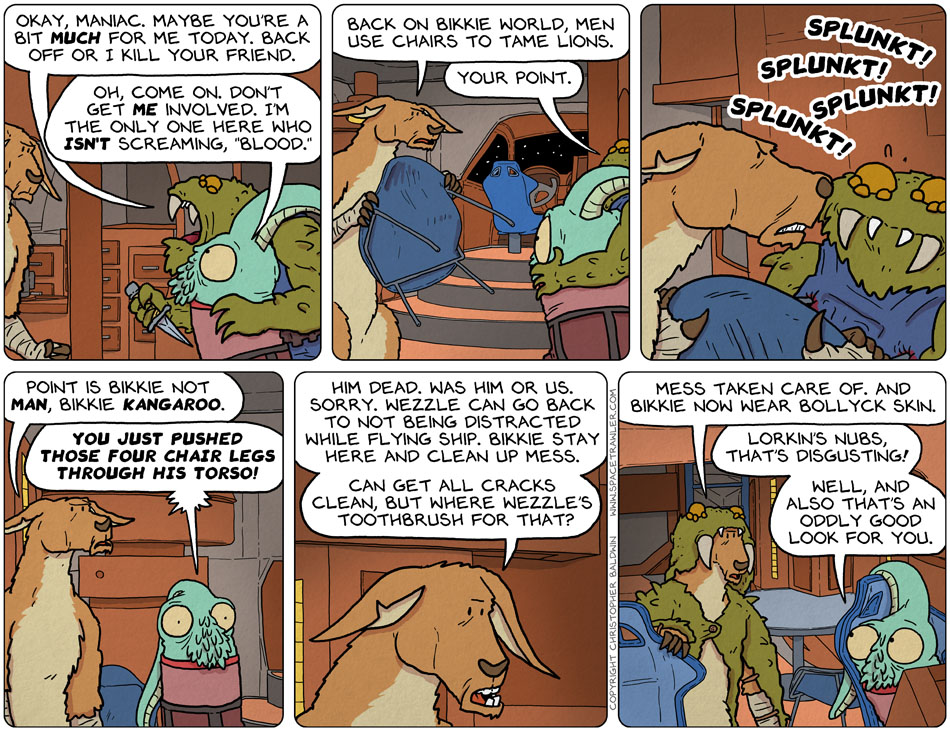 re: yesterday’s strip, also digging the pre-kick “PAF”, “WHAP”, tail-stand:”SWISH” controlled blocks while ‘trying to think’ of an alternative to killing. I assume that the philosophy has matured Bikkie’s fighting techniques as well as his mind. Realizing this is non-cannon (but should be IMHO), Bikkie seems to be developing the finesse of a master, and the tactical acumen to defend against line-of-sight energy weapons. He should keep the reflective armor.