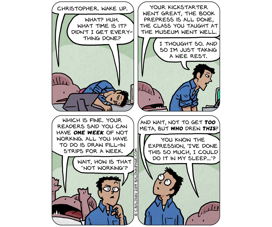 In case you felt concern for my flippant self-imposed workaholicism: the strips this week (4, which will appear all at the normal Spacetrawler times) do go pretty quickly. It’s not a week “off,” but it is a week with a lot more time for me to get my head straight and ducks in a row for starting the new Spacetrawler story right.
