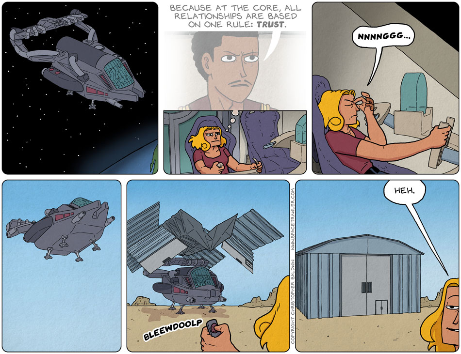 Chris, I’ve always loved your SFX. “Bleewdoolp” is exactly what a small spaceship disguising itself as a shed should sound like. Plus it’s fun to say. I can’t listen to your narrative of the strip at work, but I sure hope you said it.