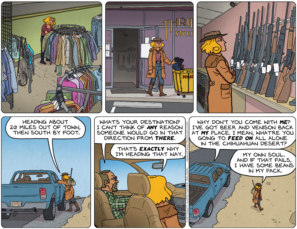Emily being such a rough-and-ready character, I won’t bother mentioning water, a tent (not carried, I can see) or even her bedroll, which I imagine is thin the way she grew up with it. All of this just makes me think that her soul, like the rest of her, is going to be one tough chew. Even for her. I’d wish her well, but I know she’s going to be interrupted. Hell, it’s what I would do. Nobody’s plans work out the way they thought they would to begin with. That’s where the fun comes in. Sometimes armed!