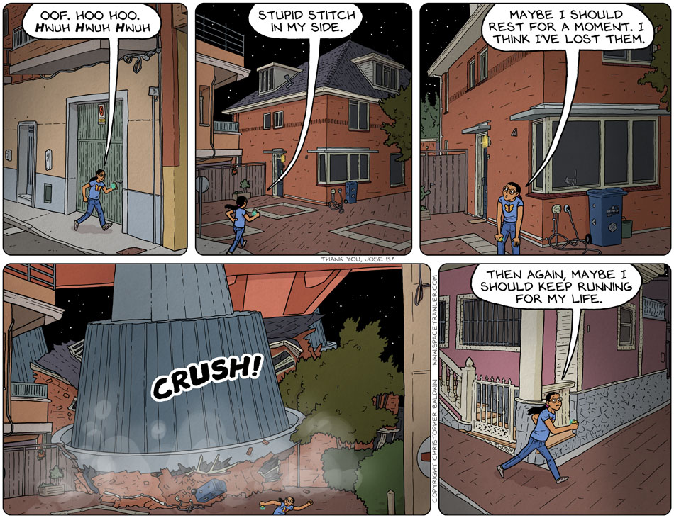 I wonder why none of the neighbors in any of these strips (particularly the one above) are calling the police to complain about the noise, to complain about the construction company doing house demolitions at this time of night, to report a large airplane (because, c’mon, a SPACESHIP?) has crashed, crushing the house next door, … ANYTHING!