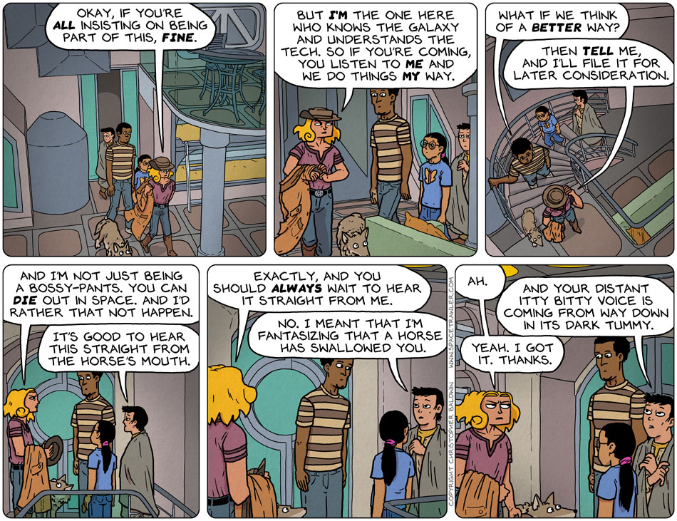 Even when Nogg learned Dustin wasn’t the guy he wanted, he let Dustin stay on the ship. Nogg came to regret that, true (at one point he even apologized to Dustin for not returning him to Earth as soon as Nogg realized he’d gotten the wrong brother), but Dustin didn’t go into space of his own free will. Which, perhaps, explains why, unlike most of the characters, Dustin never really learned from his experiences: because he didn’t WANT to experience them. Much like J.K. Rowling’s Pansy Parkinson, there was AFAIK no “redeeming moment” for him.* Which I presume was Mr. Baldwin’s intention exactly. 🙂