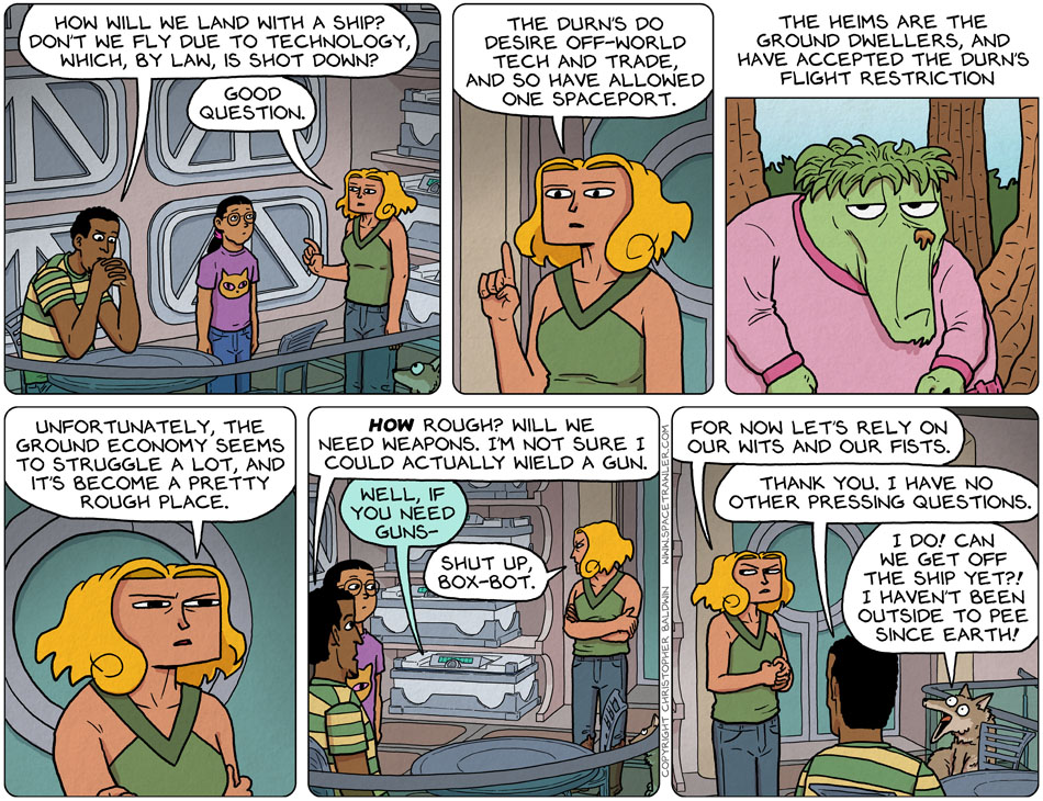 Saaaay, what happened to Emily’s rifle she bought on Earth? Wouldn’t it be too big to fit in the box-bot? Although I suppose she could have disassembled it (one more step to getting it ready to use) and stored the pieces. Hm.