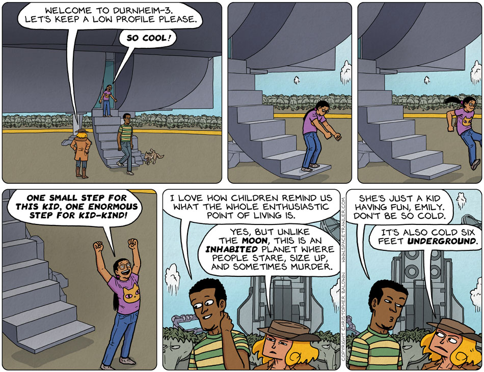 Hi Chris. Your choices of what to exclude from the audio version are fascinating. You didn’t mention the crowd of Heims in the background and that in the last 2 panels they are ominously closer. I think they are significant, but maybe not. Have to wait and see.