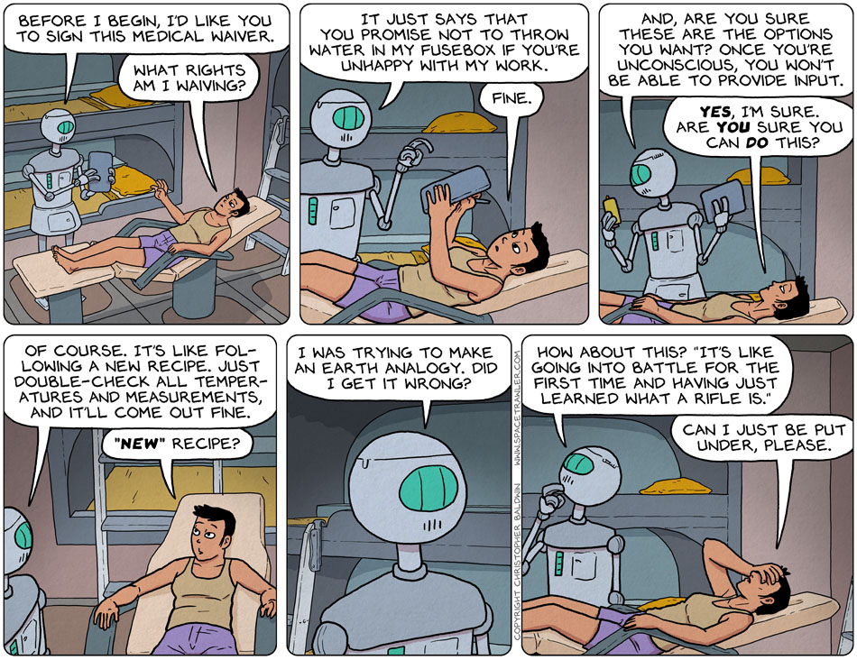 The new recipe analogy at least makes it seem like he’s followed recipes before, i.e. performed some sort of surgery before and the new part is the human anatomy/biology, where the battle analogy implies he’s not performed any sort of medical procedure before but he’s just read up on scalpels. I hope it’s the former rather than the latter, or that his instructions are really precise and clear. On the other hand, Joyce came out of modifications just fine, so maybe humans really are simple creatures to work on compared to other beings in the galaxy and just reading the manual will be enough.