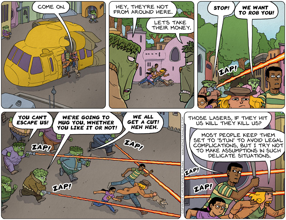 “Hey! Those aliens are running from a rob-mob! They gotsa ta be rich! Let’s robbem!”