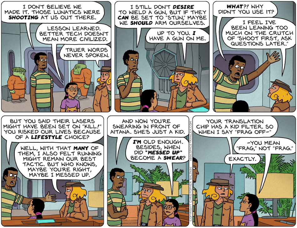 I’m just trying to imagine what a Zerhakker filter would sound like in Spacetrawler, and I get tangled up in the possibilities of an arcane filler word having a crucial and downright awful meaning in the local language that results in misunderstanding, crosstalk, bad feelings and thrown objects. The joke appeal is obvious, but I can see that arcane filler becoming the local synonym for ‘bad aliens’ or ‘unhygienic aliens’ or any of a dozen other bad traits you wouldn’t want to be known for.