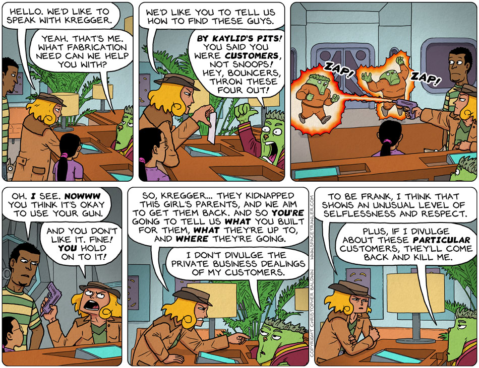 I love the backgrounds for this scene. They’re space cool but somehow incredibly ordinary. And they don’t give away anything about Kregger’s business. I need to know what he’s making/doing/selling to the bad guys!