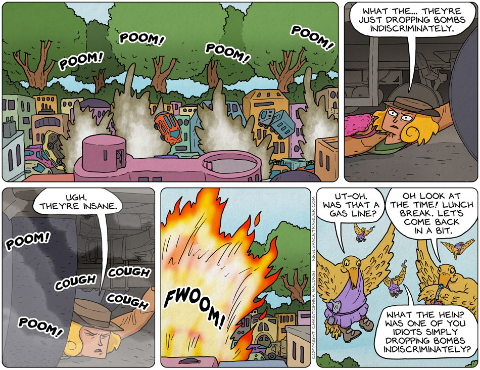 02/26/20 – Indiscriminate Bombing Spacetrawler, audio version For the blind or visually impaired, February 26, 2020. https://www.baldwinpage.com/spacetrawler/wp-content/uploads/sites/15/2020/02/2020-02-26-audio-ST.mp3 Previous | Next 1st Series | 2nd Series | 3rd Series | First Strip Current Series | Archive | Most Recent Previous | Next 1st Series | 2nd Series | 3rd Series | First Strip Current Series | Archive | Most Recent Look out where unchecked enthusiasm might lead you. First Strip First Series | First Strip Second Series | First Strip Current Series| Archive | Most Recent 02/25/20 – Useful Traffic 02/27/20 – Gas Line Fire 12 Comments Efogoto February 26, 2020 at 12:09 am 6 years ago No. Not just *one* of us. Efogoto February 26, 2020 at 12:12 am 6 years ago In the final panel, the first word balloon begins “Ut-oh.” Is that a typo for “Uh-oh”, or just an alternate spelling? Christopher Baldwin February 26, 2020 at 12:18 am 6 years ago Alternate spelling. 🙂 Jim Campbell February 26, 2020 at 12:52 am 6 years ago Ah, local dialect. Jeffrey Klein February 28, 2020 at 1:36 am 6 years ago “Ut-oh” was Carl Barks’ preferred spelling of it, and there’s only a few items where following in his footsteps would be a poor choice. Coyoty February 26, 2020 at 1:16 am 6 years ago They bombed out of arsenal management class. Blew it off completely. DSL February 26, 2020 at 12:42 pm 6 years ago They dropped the class. Indiscriminately, of course. Dockie February 26, 2020 at 8:19 am 6 years ago Suddenly, a Fan-Fic is born about violent revolution in this planet. soweli nasa February 26, 2020 at 4:55 pm 6 years ago I thought the white ibis was the most asshole bird, but these sky bastards are in the running. Pete Rogan February 26, 2020 at 4:57 pm 6 years ago Durnheim-3 needs a warning sign, on multiple satellites around the system: WARNING! CRIMINAL PLANET AHEAD! YOUR LIFE AND PROPERTY ARE IN DANGER! Signed: The Chamber of Commerce. Muzhik February 26, 2020 at 7:00 pm 6 years ago Look out where unchecked enthusiasm might lead you. Dude, I’ve enjoyed (no, seriously) MAJOR ADHD for the past 60 years. I could have told you about the results of “unchecked enthusiasm”. As my Facebook Life Motto says, Ut visum notitia bona id temporis. (“It seemed like a good idea at the time.”) Muzhik February 26, 2020 at 7:03 pm 6 years ago Looks like they were dropping “POOM!” bombs. it could have been worse. They could have been dropping “F” bombs. (Unless that’s what that last “FWOOM!” was…) Leave a Reply Cancel reply Your email address will not be published. Required fields are marked *CommentName* Email* Website Notify me of follow-up comments by email. Notify me of new posts by email.