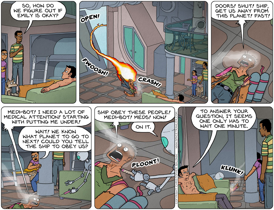 I’m having a bad flashback to how Martina looked after a brush with the unclamped but demented Eebs. Never mind the excellent Galactic medical care, War Pig is right about the crash after-action. Some people get more cautious, but from what we know about Emily I think she might go the other way and draw a little faster the next time. Which will kind of blow the whole ‘not-trust-in-guns’ direction she was taking.