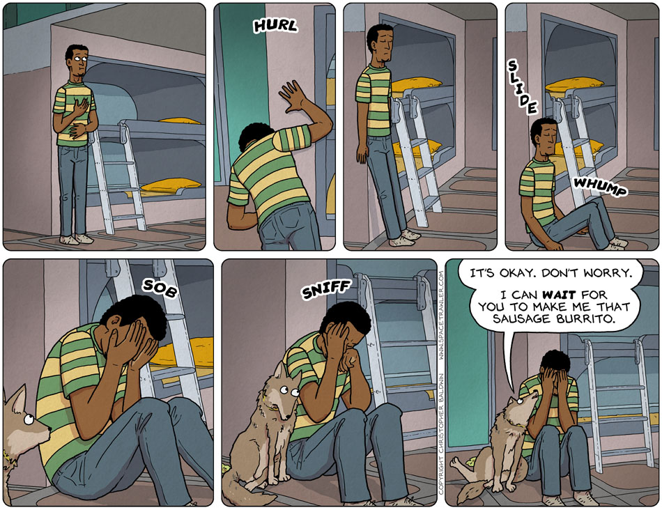 Alternately, “You appear to be sad, but I also wanted to let you know that you’re sitting on a perfectly good breakfast.” (sob) “Also, I’m still waiting on that sausage burrito.”