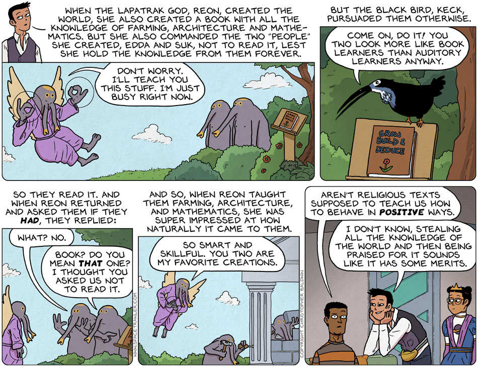 “Here’s this book I command that you not read. It contains all kinds of stuff I don’t want you to know until I feel you are ready for me to teach you. I shall go away for a time then return. Do NOT read the book!”