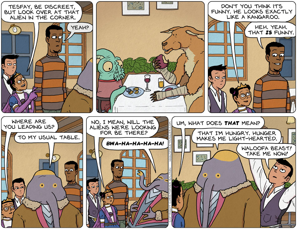 I love the fact that a tentacled alien and an expatriate kangaroo sitting down at a little two-top for an elegant lunch with wine manages to look perfectly normal and unremarkable.