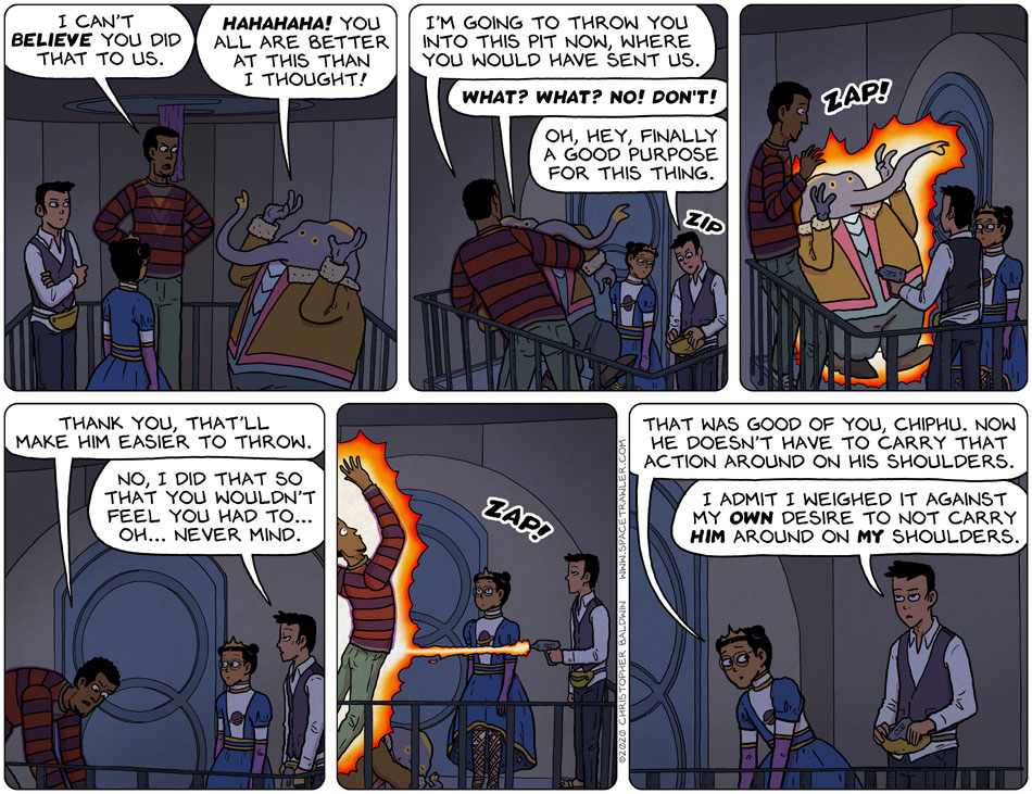 The “compassionate zap” is like a “thing” in the Spactrawler universe, isn’t it? I mean, if you could harmlessly make a friend unconscious, and saw they were about to do a bad thing in the heat of the moment that you knew they’d regret, would you zap them?