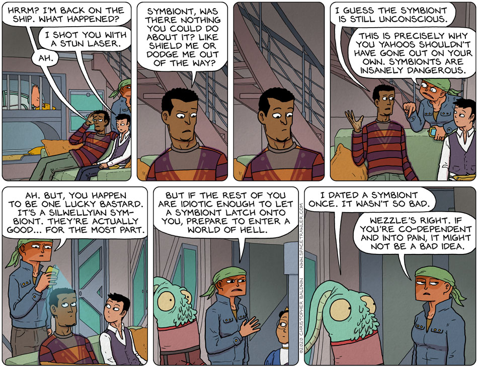 Should have realized Emily would have the dope on symbionts. Still, I would give a great deal to quiz the approxiscan on the capabilities and tendencies of Silwellyian symbionts about now. This is an entirely new kind of Galactic life-form and I would like to learn more about them and this one in particular. Well, actually, I’m curious about any lifeform that earns the sobriquet ‘insanely dangerous.’ In what way? What do I need to watch out for? Or is it already too late?