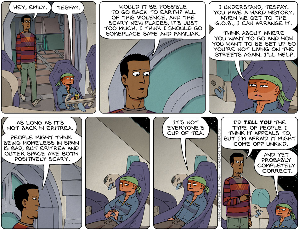 Also, in panel 5, I think Emily is contemplating the distance between herself when and where she now is, and a traumatized Eritrean who is at the end of his rope. The explanation of the type of people who enjoy space and its adventuring is very likely something she would profit from hearing, but I don’t think she wants to put either Tesfay nor herself through that. Not just now.