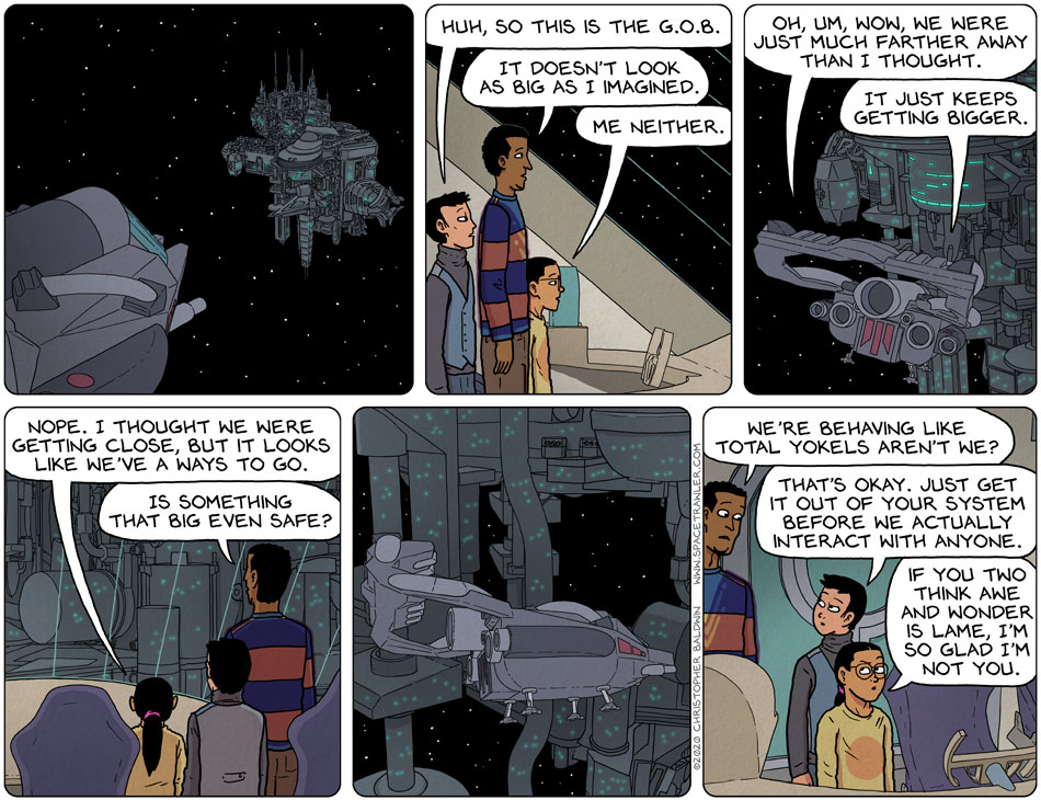 SF moviemakers worked this out very early in the game, and added patterns of lit windows to their spaceships to convince modern brains to scale them as “enormous buildings.” This has now become so widely used and accepted, that nobody really wonders why a Star Destroyer would have so many rooms with a view.